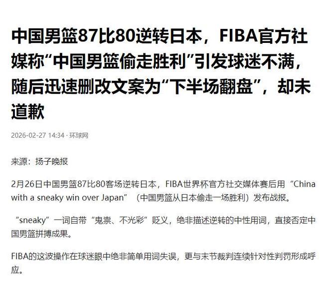 国际男联称“中国男篮偷走胜利”。